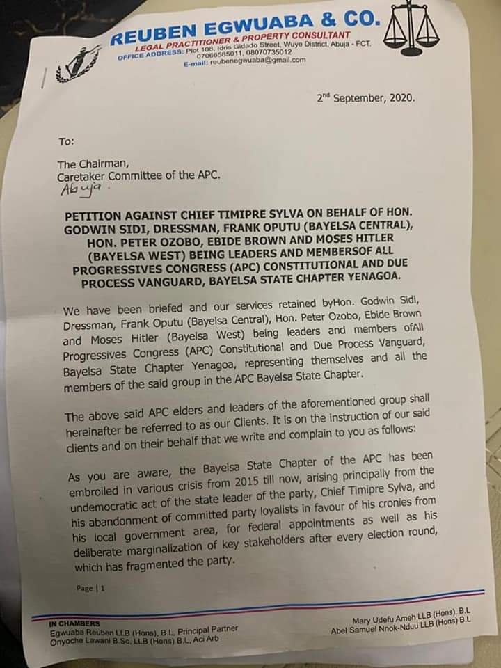 Some aggrieved leaders of the APC from Bayelsa Central and Bayelsa West Senatorial Districts have forwarded a petition to the Chairman, Caretaker Committee of the party against the conduct of the state’s party leader, Chief Timipre Syva.