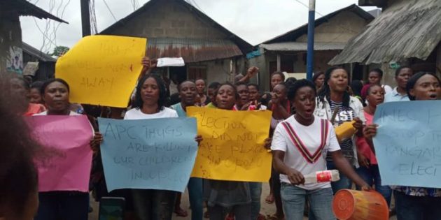 Our Correspondent ran into women in peaceful protest against an alleged invasion by party thugs who invaded various polling units carrying dangerous weapons and shooting sporadically.