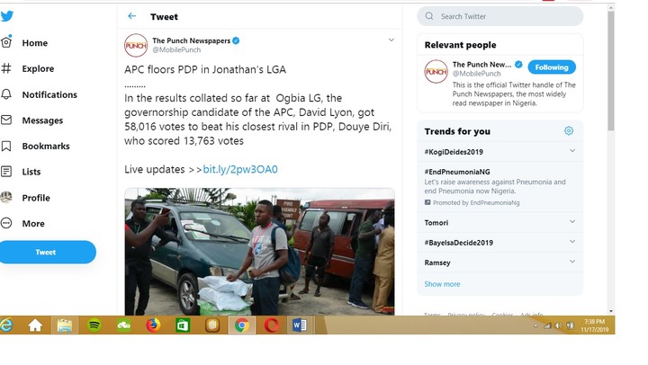 In the results collated so far at Ogbia LG, the governorship candidate of the APC, David Lyon, got 58,016 votes to beat his closest rival in PDP, Douye Diri, who scored 13,763 votes