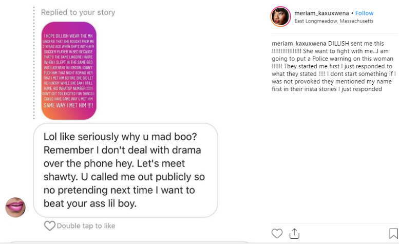 Namibian beauty queen, Meriam Kaxuxwena, who won Miss Africa Tourism Universe in 2014, has taken to social media to expose the message she received from Big Brother Africa The Chase winner, Dillish Mathews who is threatening to beat her up over her footballer- boyfriend, Emmanuel Adebayor.