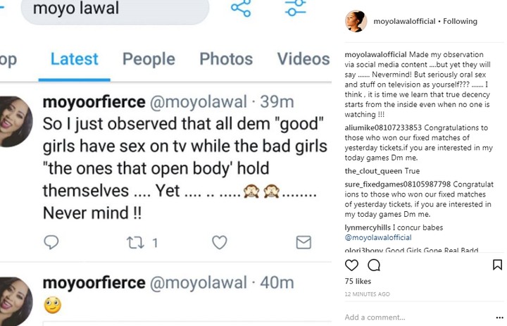 “So I just observed that all dem “good” girls have sex on tv while the bad girls “the ones that open body’ hold themselves …. Yet …. .. …………. Never mind !!
