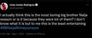 Uche Jombo in a tweet said this year’s season has no entertaining value in it and it’s just boring to her but doesn’t know what others think about the show as in her opinion it’s the most boring show ever in the history of the reality show. .