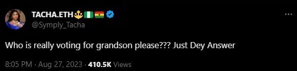 In a post via Twitter, she wrote, “Who is really voting for grandson please??? Just Dey Answer.”