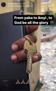 Boma flashed his house keys in a photo he shared on his Instastory and also wrote “from Yaba to Ikoyi, to God be the glory”.