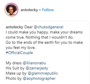 Recently, Anto and comedian Chuks have been dropping pre-wedding photos to paint a picture that they are engaged with industry resources revealing it’s a mere publicity stunt agreed to by Anto.