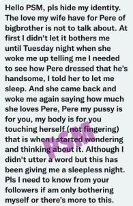 Narrating his dilemma, he wrote,“The love my wife have for Pere of BigBrother is not to talk about. At first I didn’t let it bother me until Tuesday night when she woke me up telling me I needed to see how Pere dressed that he’s handsome, I told her to let me sleep.