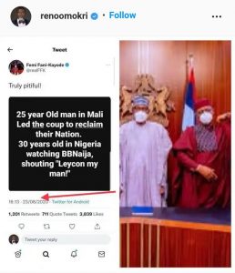 As bbnaija ends, Nigerians should be reminded that a year ago, Femi Fani- Kayodr was condemning Nigerian youths for not being patriotic enough to save their country from buhari, like colonel Assimi Goïta, the youthful Mali coup leader, and instead focusing on Big Brother Naija. Exactly a year after he made that statement, Big Brother Fani- Kayodr who condemned Nigerian youths, was himself Commending Buhari. No be JuJu be that?