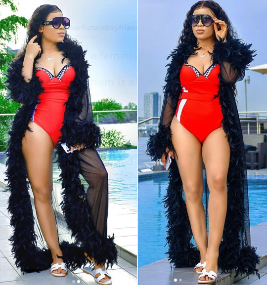 BBNaija reality star, Nina shared these new sexy photos of herself posing by the poolside while clad in a red swimwear and black cover-up.