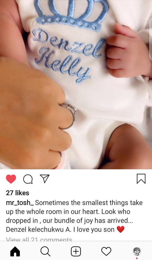 “Sometimes the smallest things take up the whole room in our heart. Look who dropped in, our bundle of joy has arrived….DENZEL KELECHUKWU A. I love you son”
