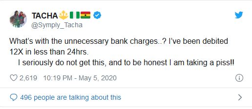 “What’s with the unnecessary bank charges..? I’ve been debited 12X in less than 24hrs. I seriously do not get this, and to be honest, I am taking a piss!!,” Tacha wrote on Twitter.
