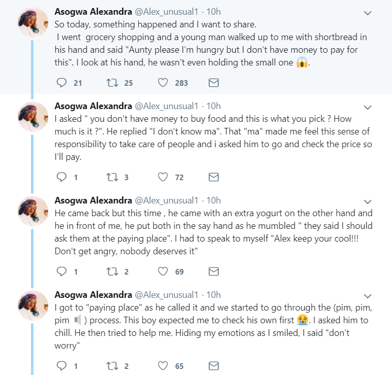 Former big brother Naija housemate, Alex Unusual has taken to Twitter to recount her experience with a young man who walked up to her for help while she was grocery shopping.