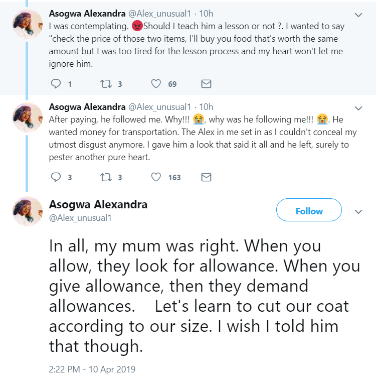 I was contemplating. �Should I teach him a lesson or not ?. I wanted to say “check the price of those two items, I’ll buy you food that’s worth the same amount but I was too tired for the lesson process and my heart won’t let me ignore him.