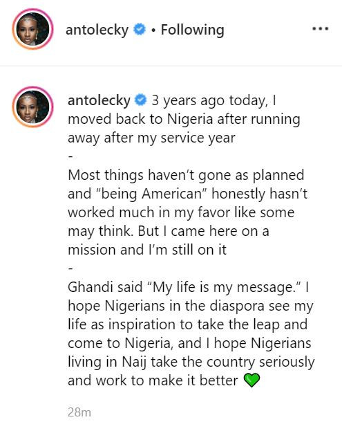 Ghandi said “My life is my message.” I hope Nigerians in the diaspora see my life as inspiration to take the leap and come to Nigeria, and I hope Nigerians living in Naij take the country seriously and work to make” she wrote on Instagram
