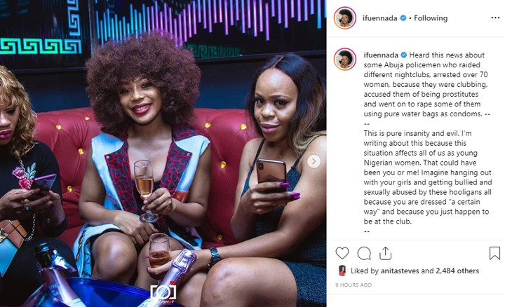Ifu Ennada has reacted to the arrest of over 70 women at an Abuja nightclub, a move she described as pure insanity and evil.The reality show star who imagined hanging out with her friends and getting bullied and sexually abused by the police she said are hooligans, said she wrote about the incident as it affects all young Nigerian women.