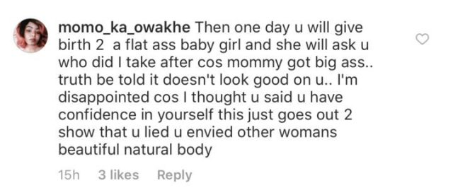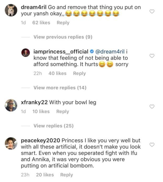 Princess, the ex-Big Brother Naija housemate has been dragged by social media users, for showing off an alleged ‘surgically enhanced’ bikini body on Instagram.The reality show star had shared her photos with the caption ‘Am outchea cheating the weather I feel good U know.’ However fans who reacted to the photo, dragged Princess for showing off a ‘surgically enhanced’ bikini body which according to them was a bad job.