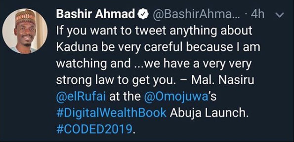 President Buhari’s media aide, Bashir Ahmed in his tweets from the event said the Kaduna state Governor warned against writing unfavourable things about Kaduna state. Mallam Nasir El-Rufai who reportedly said he is watching, added that the Kaduna State Government has a very strong law to get anyone.