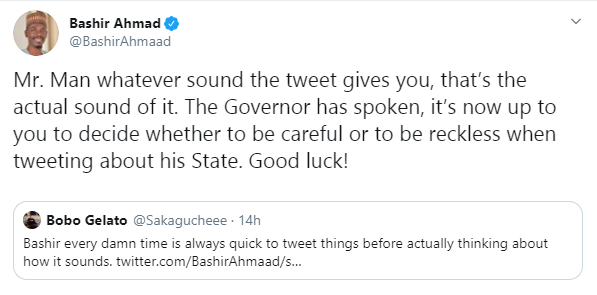 Mr. Man whatever sound the tweet gives you, that’s the actual sound of it. The Governor has spoken, it’s now up to you to decide whether to be careful or to be reckless when tweeting about his State. Good luck!