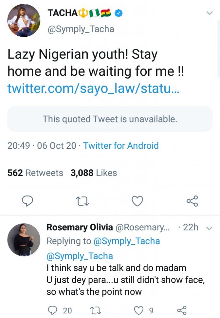 When she didn’t go out to protest, a Twitter user @sayo_law called her out for it, writing: “So Tacha didn’t lead a protest today? Disappointing”