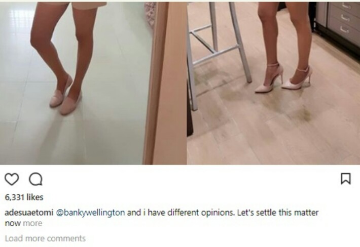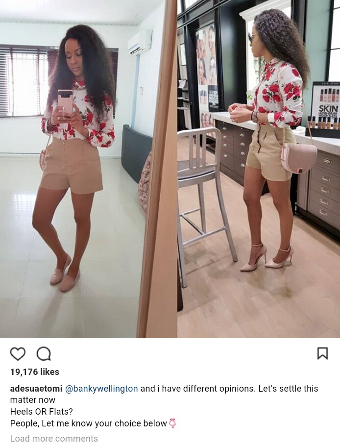 Actress and wife to Singer Banky W posted pictures of herself wearing a high-heeled shoe and a flat shoe asking his husband to select between the two.