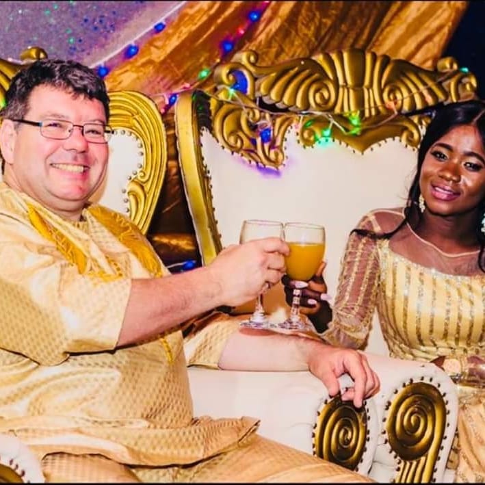 Her Caucasian husband also rocked the same colour of cloth which coordinated with Naomi’s traditional outfit. The pair sat next to each other with big smiles in gold chairs while they toasted to their new union.
