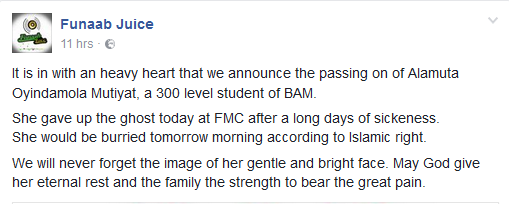 Alamuta Oyindamola Mutiyat, a 300 level student of the Federal University of Agriculture, Abeokuta, died yesterday, December 7th. According to the campus news page, Mutiyat passed away at the Federal Medical Centre after at FMC after a long illness.