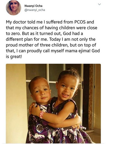 A Swiss woman who is married to a Nigerian from Anambra state, has shared her touching story after she thought she wouldn’t have children because she was diagnosed with Polycystic Ovarian Syndrome PCOS. According to woman who is now a mother of three including a set of twins, she shared her story in a bid to encourage other women who are waiting to get pregnant and tell them there is hope.