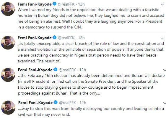 Former Aviation Minister, Femi Fani-Kayode has called on members of the National Assembly to begin impeachment proceedings against President Buhari following the suspension of Justice Walter Onnoghen as the Chief Justice of Nigeria.