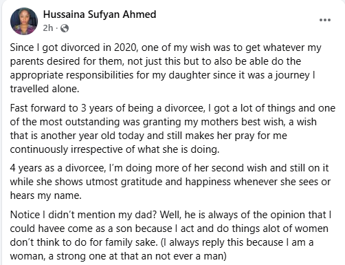 Hussaina stated this in a Facebook post on Sunday, August 17, 2025, as she marks almost five years post divorce.