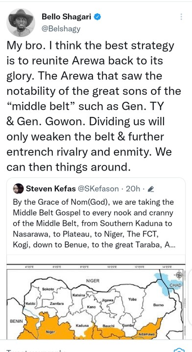 My bro. I think the best strategy is to reunite Arewa back to its glory. The Arewa that saw the notability of the great sons of the “middle belt” such as Gen. TY & Gen. Gowon. Dividing us will only weaken the belt & further entrench rivalry and enmity. We can then things around.