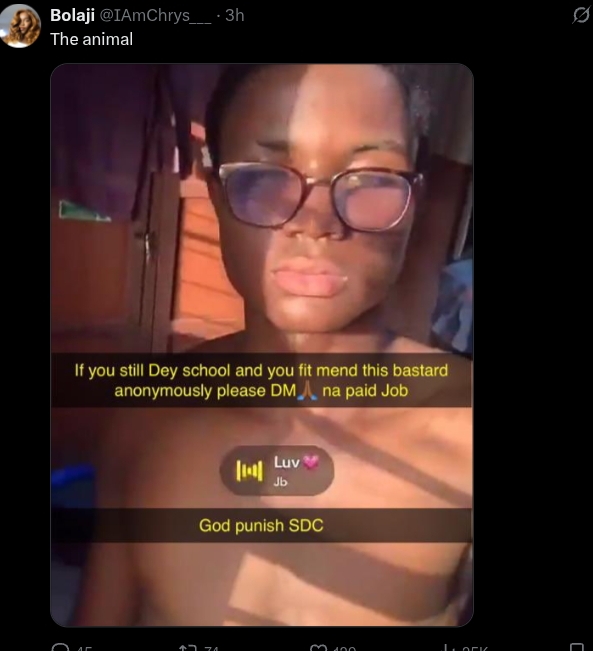 “I may not have a large Twitter following, but I hope this post goes viral. A girl was physically assaulted and beaten until she bled on March 10, 2025, by a guy at Bells University of Technology, Ota, Ogun State.”