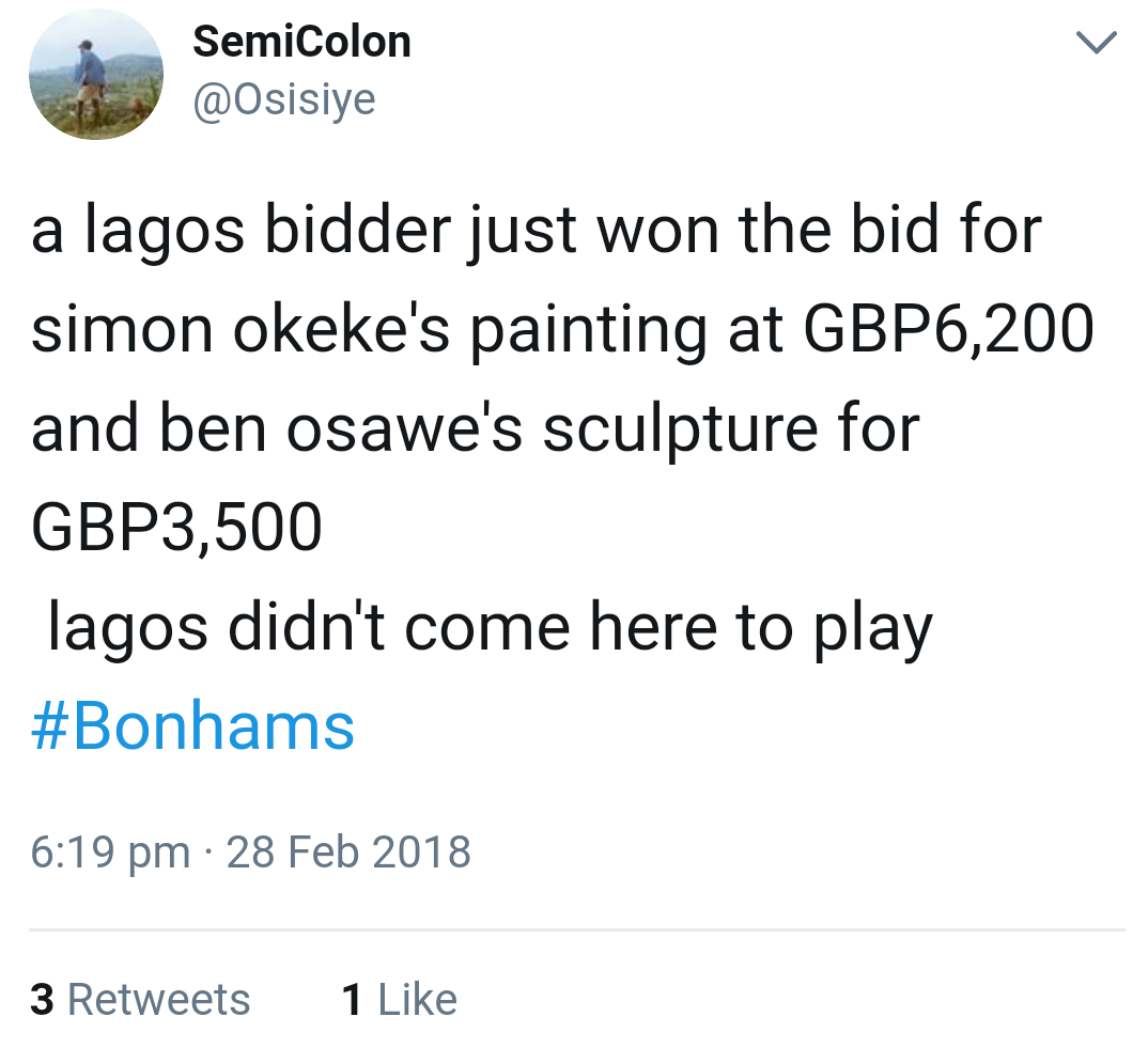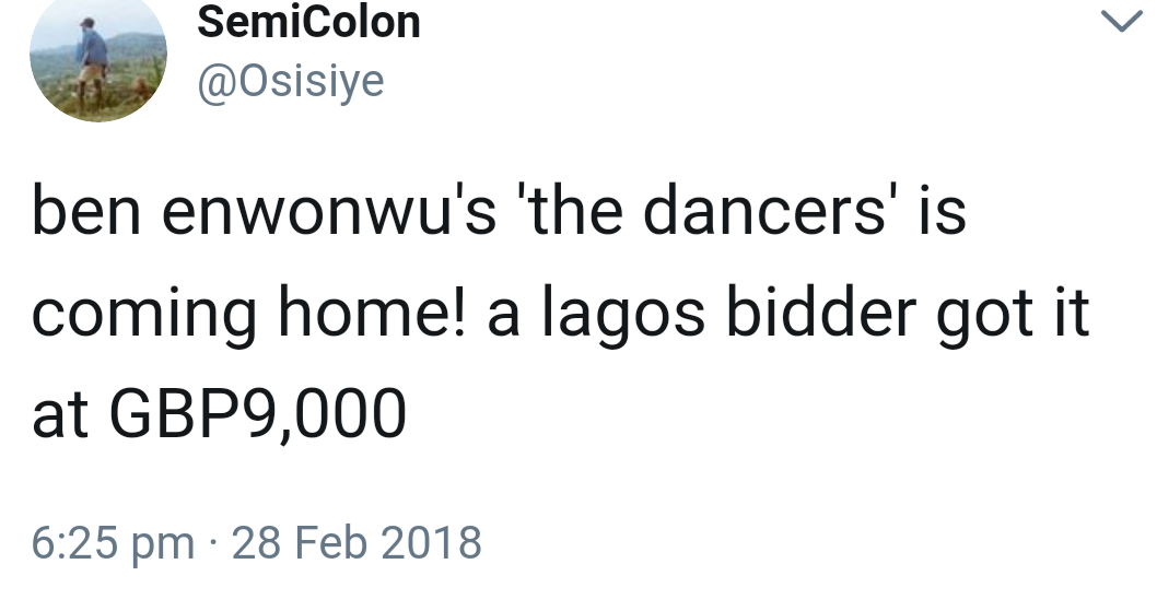 However, Bonhams also had an event at the Wheatbaker Hotel, 4 Onitolo Road, Ikoyi in Lagos where guests watched a live stream of the event and could also bid for items that were on sale. Several of the items, including “African Dancers” by Professor Enwonwu, were bought by guests in Lagos.