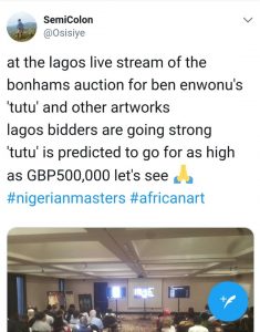 However, Bonhams also had an event at the Wheatbaker Hotel, 4 Onitolo Road, Ikoyi in Lagos where guests watched a live stream of the event and could also bid for items that were on sale. Several of the items, including “African Dancers” by Professor Enwonwu, were bought by guests in Lagos.