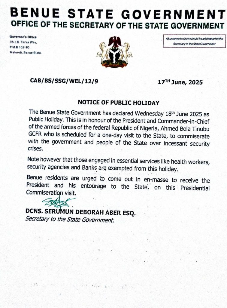 The Benue State Government has that Wednesday, June 18, 2025, would be a public holiday due to the President’s planned visit to the state.