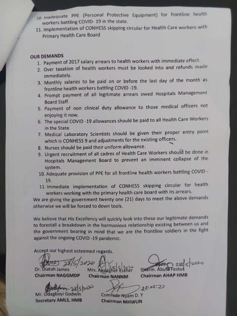 According to him, health workers in the state were owed salary arrears of between five to nine months which was unacceptable. Other demands include timely payment of salaries, payment of special covid-19 allowance, immediate implementation of CONHESS skipping of health workers at the Primary Health Centres and payment of their arrears.