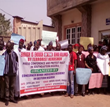HUNDREDS of indigenes of Benue State residing in five states of the Southeast geopolitical zone on Saturday staged a peaceful protest in Enugu the Enugu State capital over the incessant killings of their people living in their home state by suspected Fulani herdsmen. The states are Abia, Anambra, Ebonyi, Enugu and Imo.