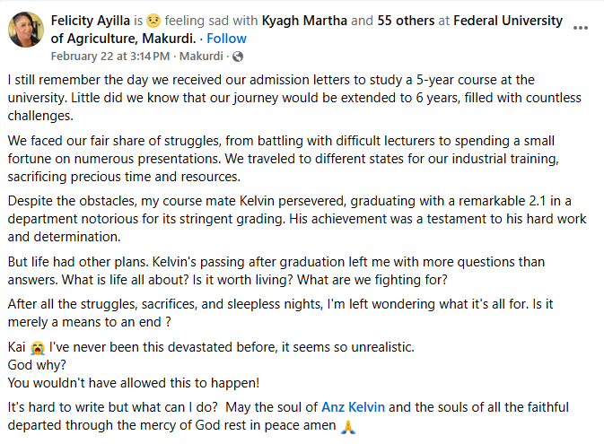 Meanwhile, friends and course mates have taken to Facebook to mourn him.