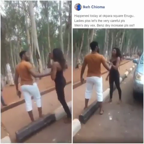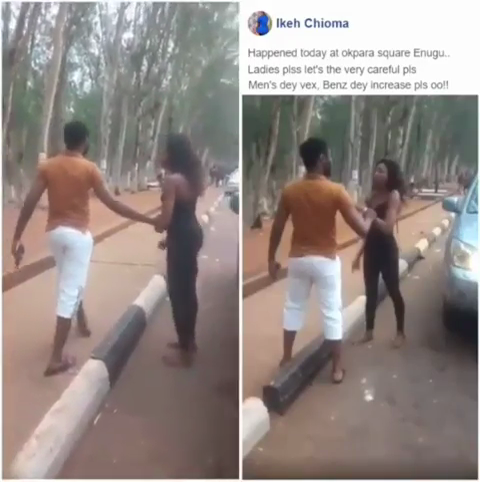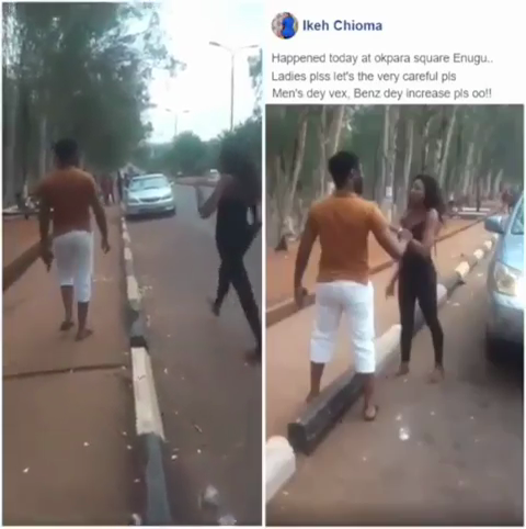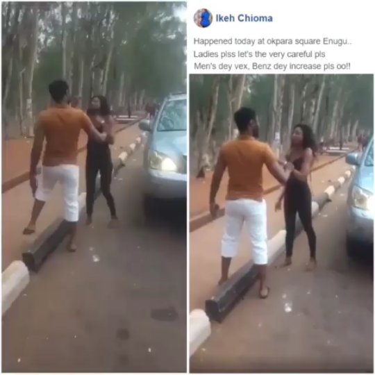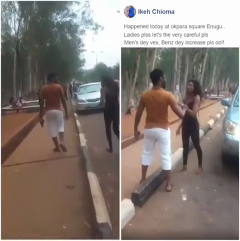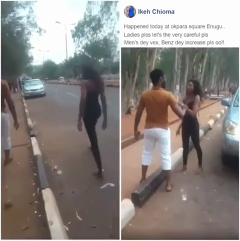 A yet to be identified lady got knocked by fresh madness after a benz dropped her at Okpara square Enugu, a man was pictured holding her in other to hinder her from stripping off