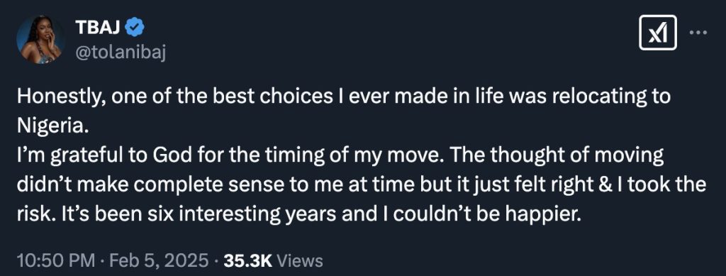 Former Big Brother Naija star, TolaniBaj has revealed that relocating to Nigeria from abroad was one of the best decisions she ever made.