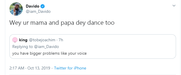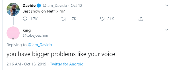 The DMW boss had taken to the social media platform to ask for the best show on Netflix, but the troll made Davido’s voice a problem and got a savage clap-back from him.