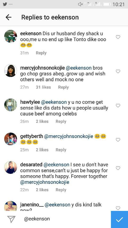 According to the fan, the actress’ marriage will end like that of her colleague Tonto Dikeh because her husband ‘dey shack am too much’. Mercy Johnson however