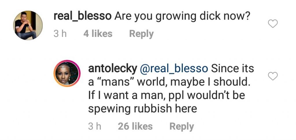 Former Big Brother Naija housemate, Anto Lecky shared the picture above on her Instagram page and one of her followers asked if she was growing a d!ck.