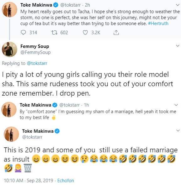 Media personality,Toke Makinwa laughed off a Twitter troll who tried to use her failed marriage to shame her.