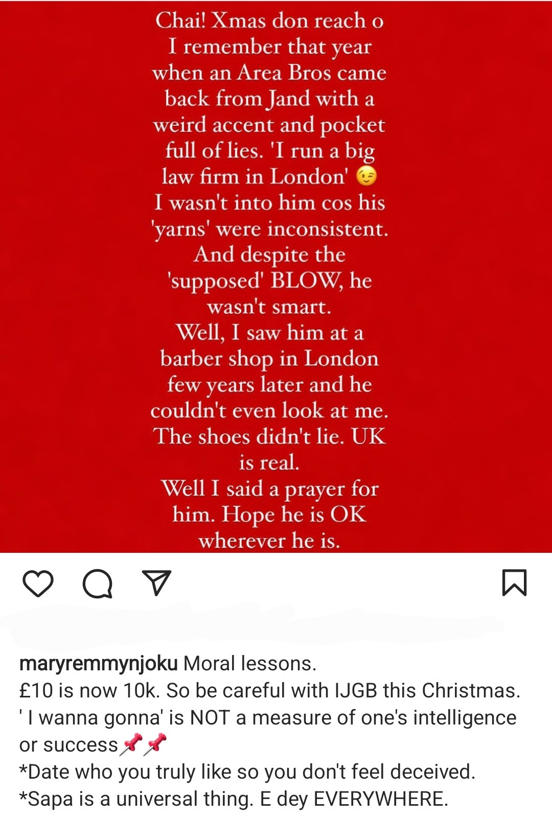 “So, be careful with IJGB (I just got back) this Christmas,” she wrote. “I wanna gonna is not a measure of one’s intelligence or success.”