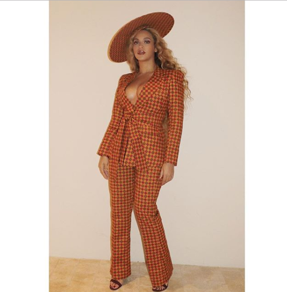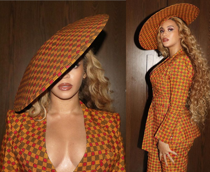 The mother of three rocked a plunging Ankara suit with matching wide-brim hat and strappy mocha heels.
