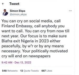 You can cry on social media, call Finland Embassy, call anybody you want to call. You can cry from now till next year. Our focus is to make sure Biafra exit Nigeria in 2023 either peacefully, by war or by any means necessary. Your politically motivated cry will end on newspapers.