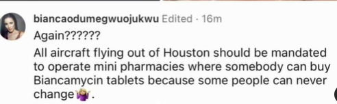 Reacting to the incident, the minister reposted the video on her Instagram page and in her caption, recommended ‘Biancamycin tablets’ on all aircraft flying out of Houston, because, according to her, some people can never change’