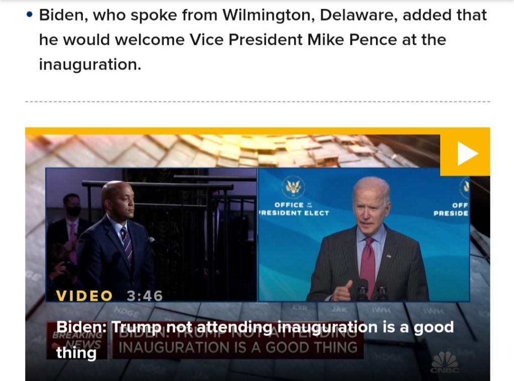 “I was told on the way over here that he indicated he wasn’t going to show up at the inauguration: One of the few things he and I have ever agreed on,” Biden said of Trump.Biden, who spoke from Wilmington, Delaware, added that he would welcome Vice President Mike Pence at the inauguration.
