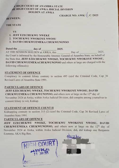 The Anambra State Ministry of Justice after all evidence and investigation by DSS has charged the three suspects for kidnap, Conspiracy and Felony at the High Court Awka, Charge No: AWK/6C/2025, has named three defendants: Jeff Nweke, Tochukwu Nwosu, and David Chukwunonso. Surprisingly, the three defendants are still walking free.