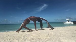 Twitter user @bahamahoopyogi was stretching with her back arched against a scenic backdrop of a golden beach and picturesque weather.