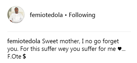 He captioned it; “Sweet mother, I no go forget you. For this suffer wey you suffer for me ♥️… F.Ote”